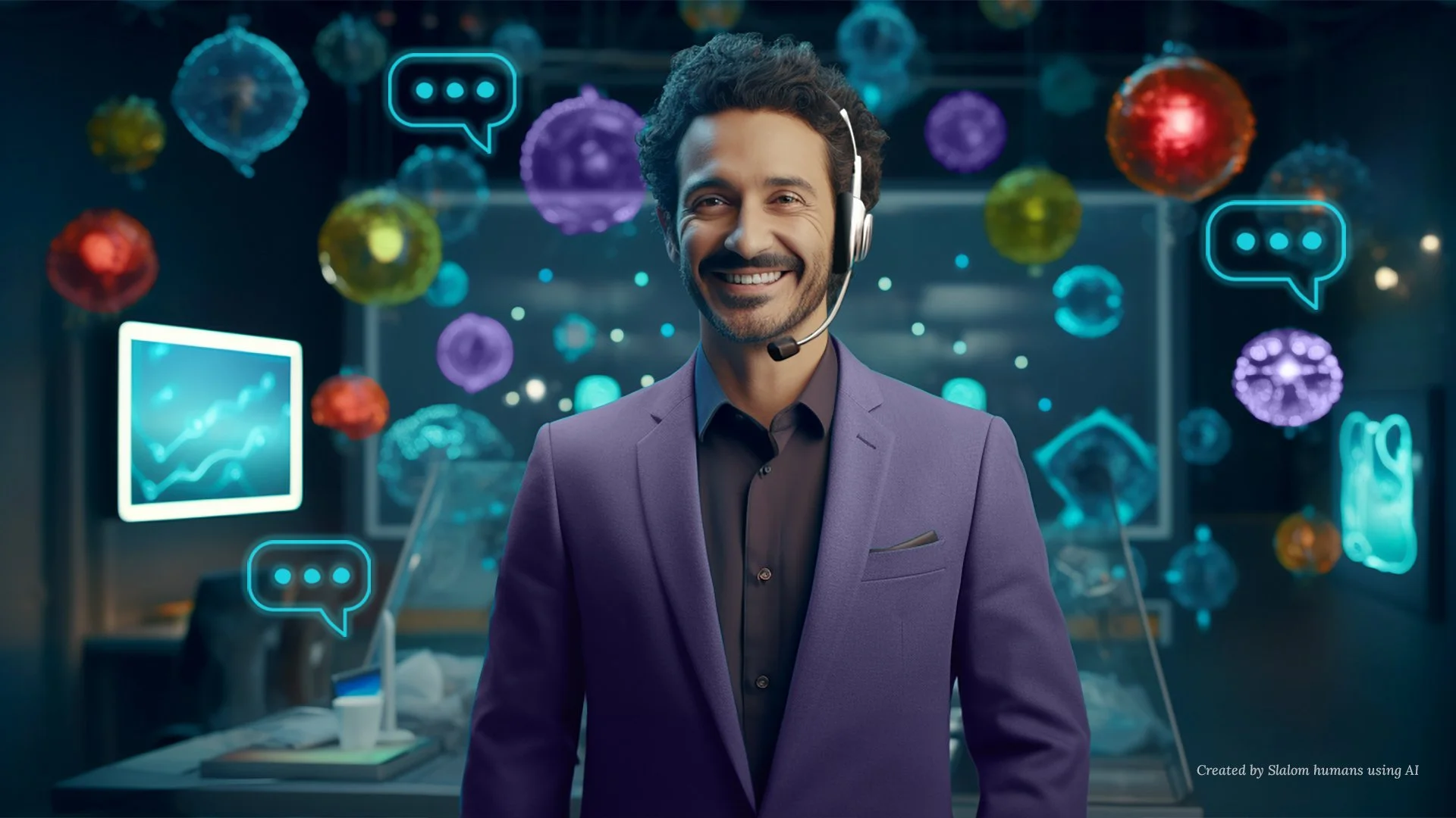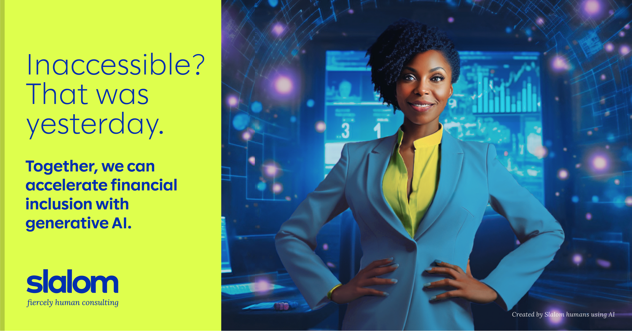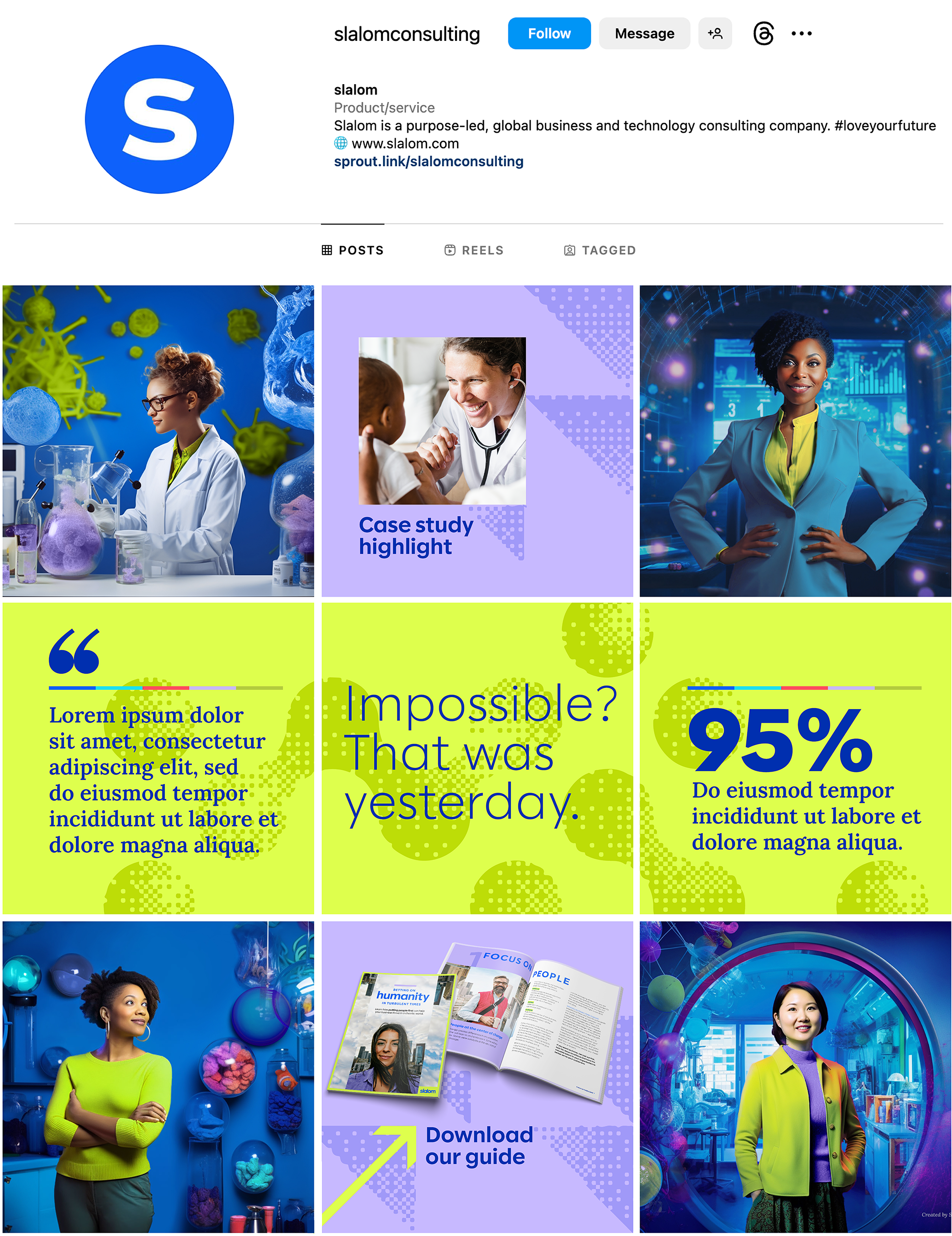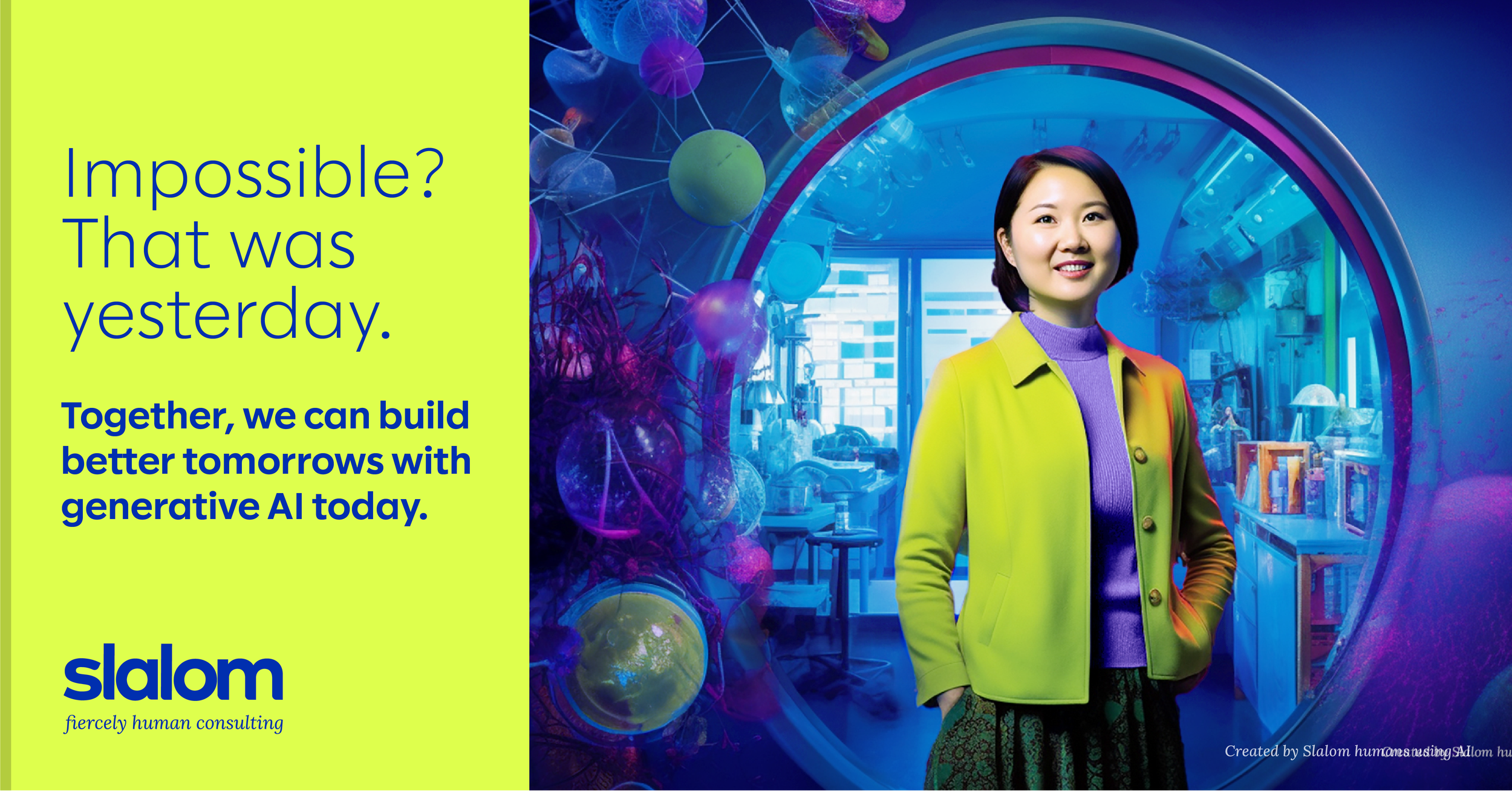 “Impossible? That was yesterday.” was a 6-month campaign focusing on the transformative power of generative AI. Using the text-to-image generative AI tool, Midjourney, we created vibrantly colored fantastical workspaces that represent the unleashed potential of individuals empowered by AI. The images straddle the line between the possible and the impossible and highlight many of Slalom’s core industries like life sciences, media and communications, financial services, etc.. The campaign came to life in paid ads, social, thought leadership, and even conference booths.