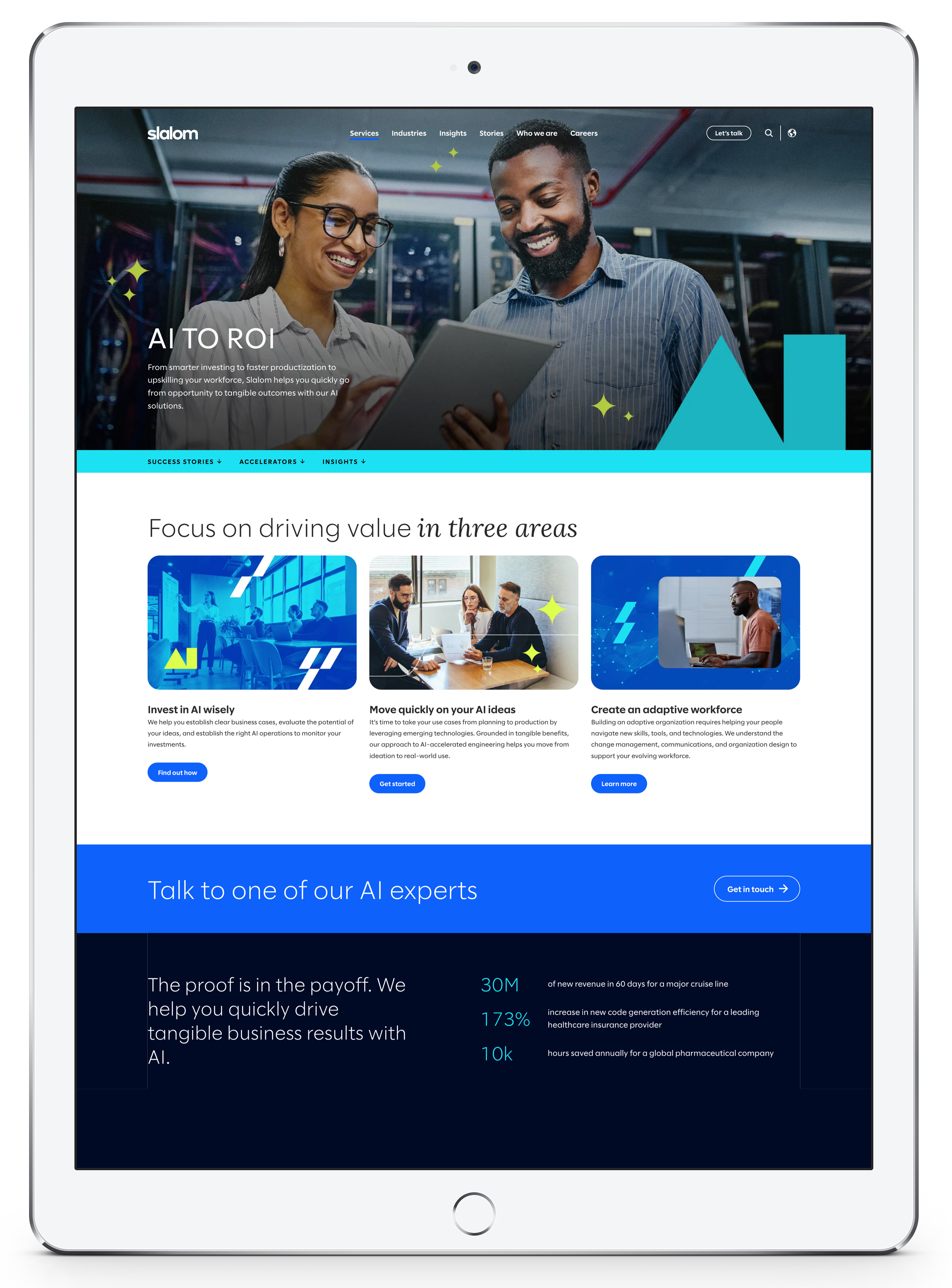Slalom’s first solutions-based campaign, “AI to ROI”, centered on the benefits of AI-enabled organizations. This campaign was created in an aggressive 5-week sprint. Deliverables included a custom landing page, organic and paid social content, thought leadership report, and campaign-themed articles with corresponding charts and graphics. Landing page views exceeded benchmark and in the first three weeks of launch drove 88 new leads and over 700 page views.