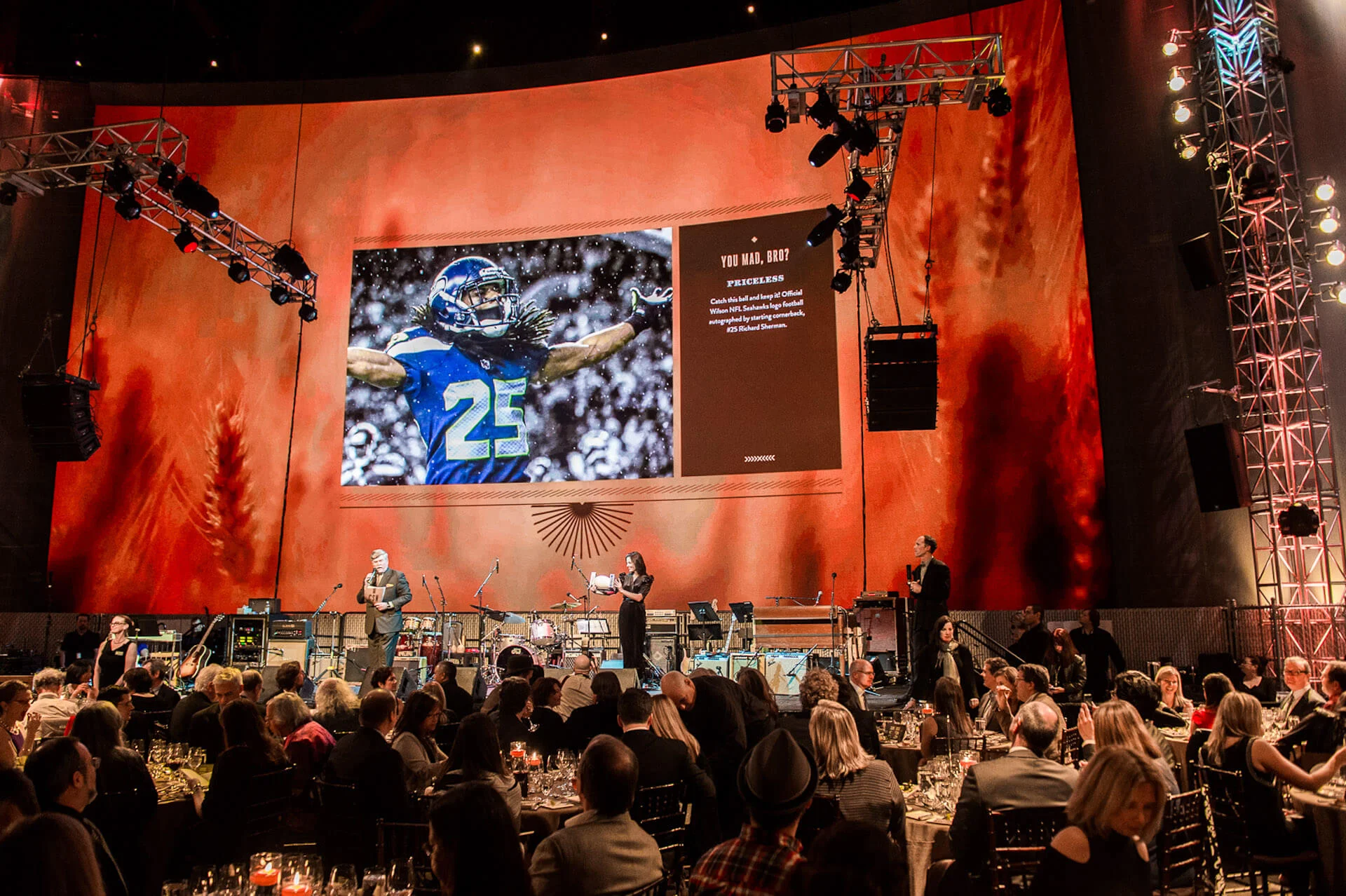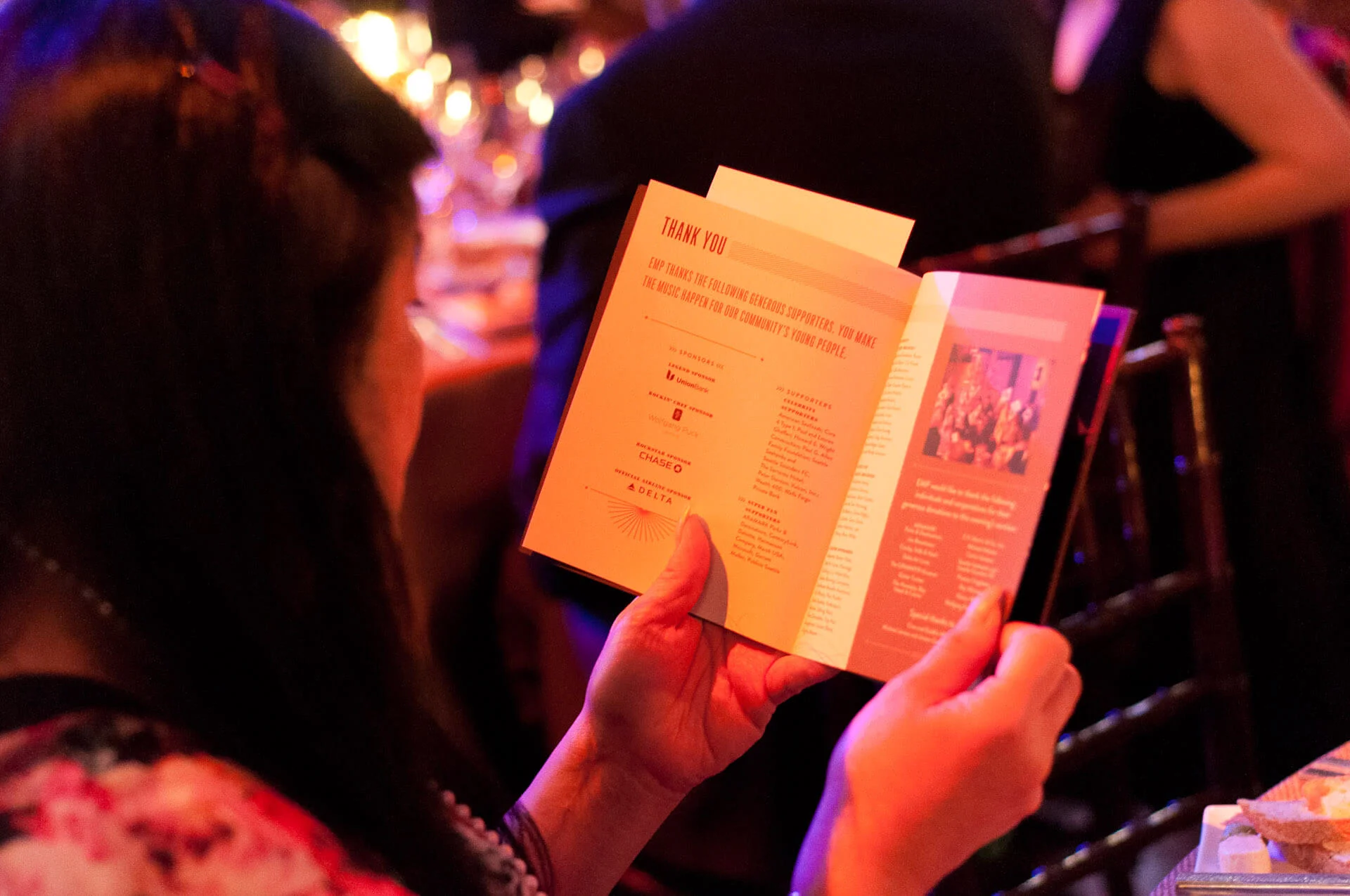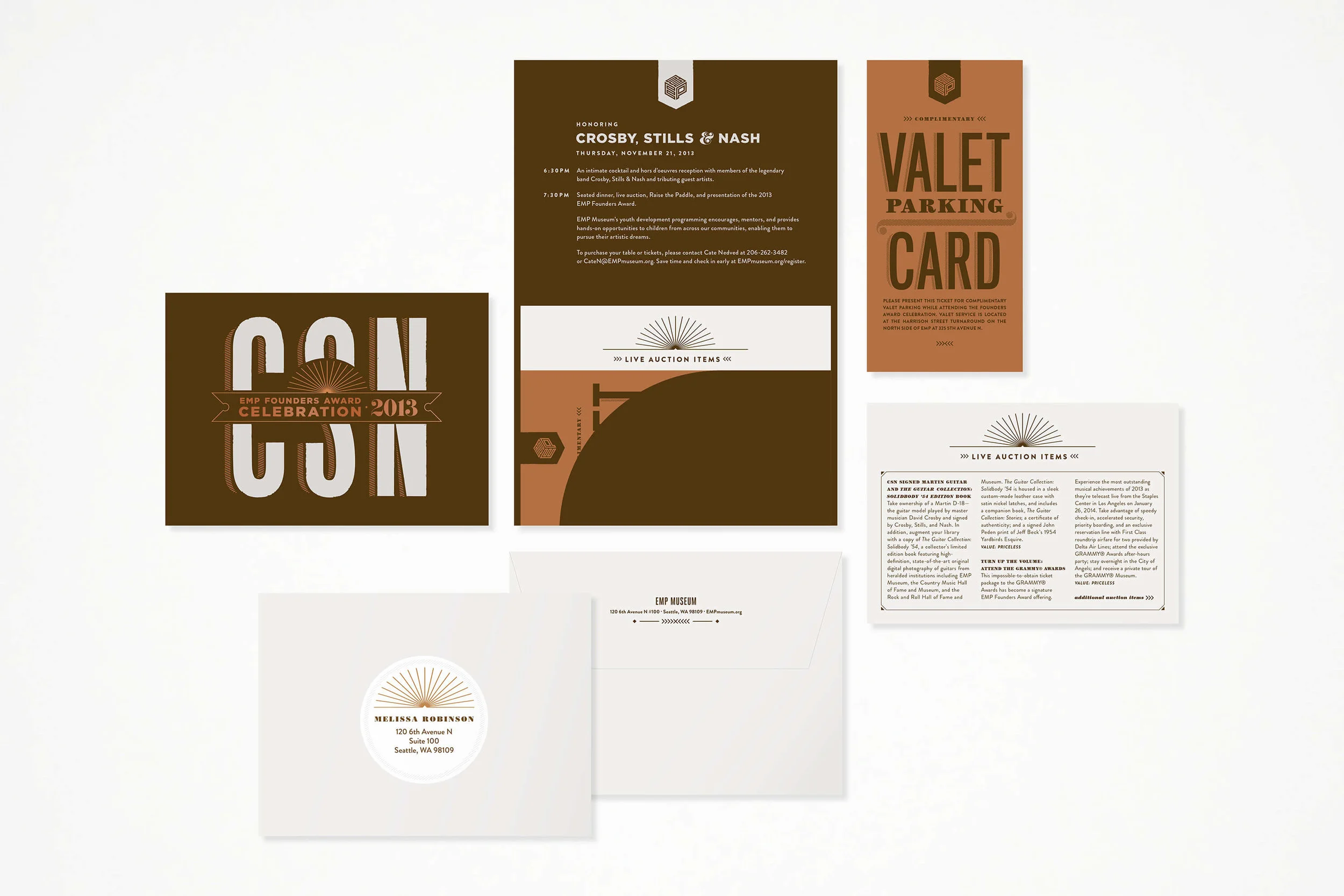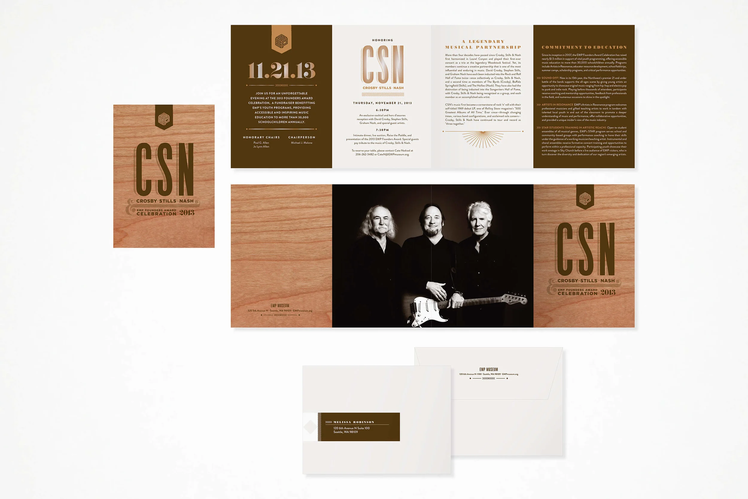 Founders Award is an annual fundraiser to benefit MoPOP's youth programs. The fundraiser features legendary performers who have made substantial contributions to the field of music. Since its inception in 2007, the gala has raised more than $2.6 million in support of vital youth development programming. In 2013, MoPOP honored legendary folk rock band, Crosby, Stills & Nash. Project Goals: Since many of our gala-goers are repeat guests, I wanted a change of pace from the modern and sleek designs of the past. Given CSN's country-rock roots and style, it was the perfect group for this design departure. Execution: I chose an organic and natural design direction, relying on a folksy color palette of brown, tan, gray, and rose gold foil. I even introduced wood as a dominant design element to further the country and rustic vibe. These choices in print affect the look and feel of the event with regards to linens, table decor, etc.