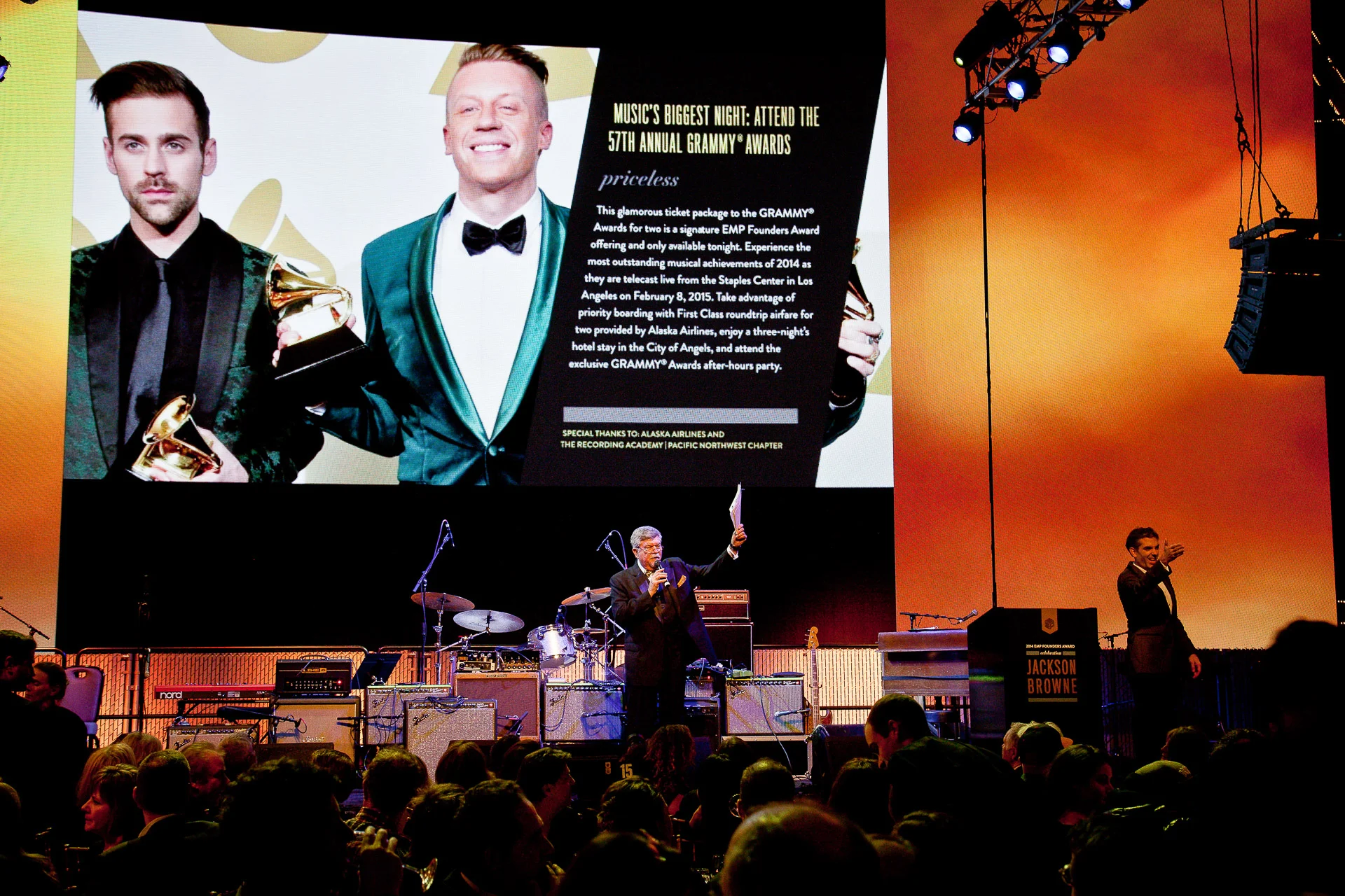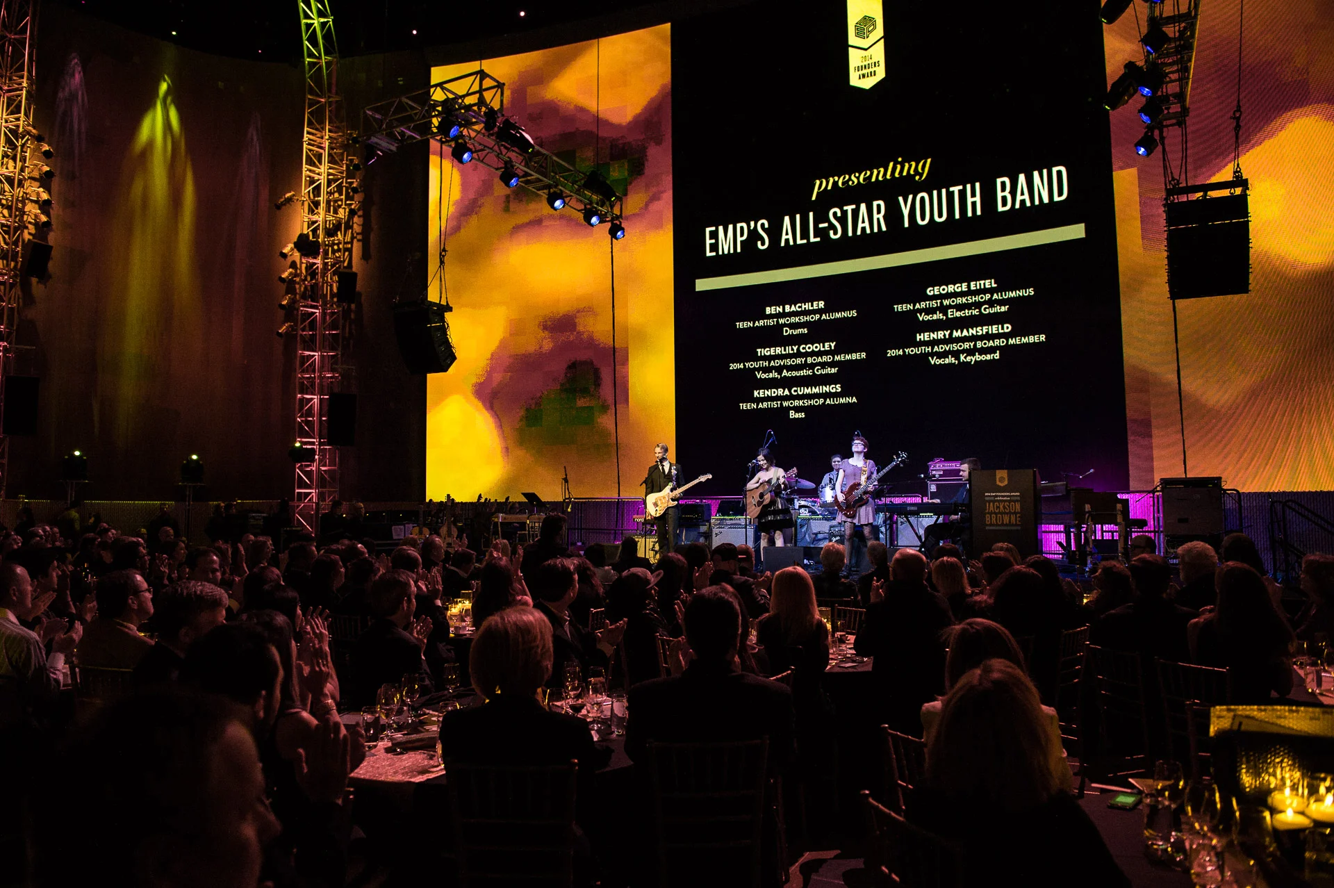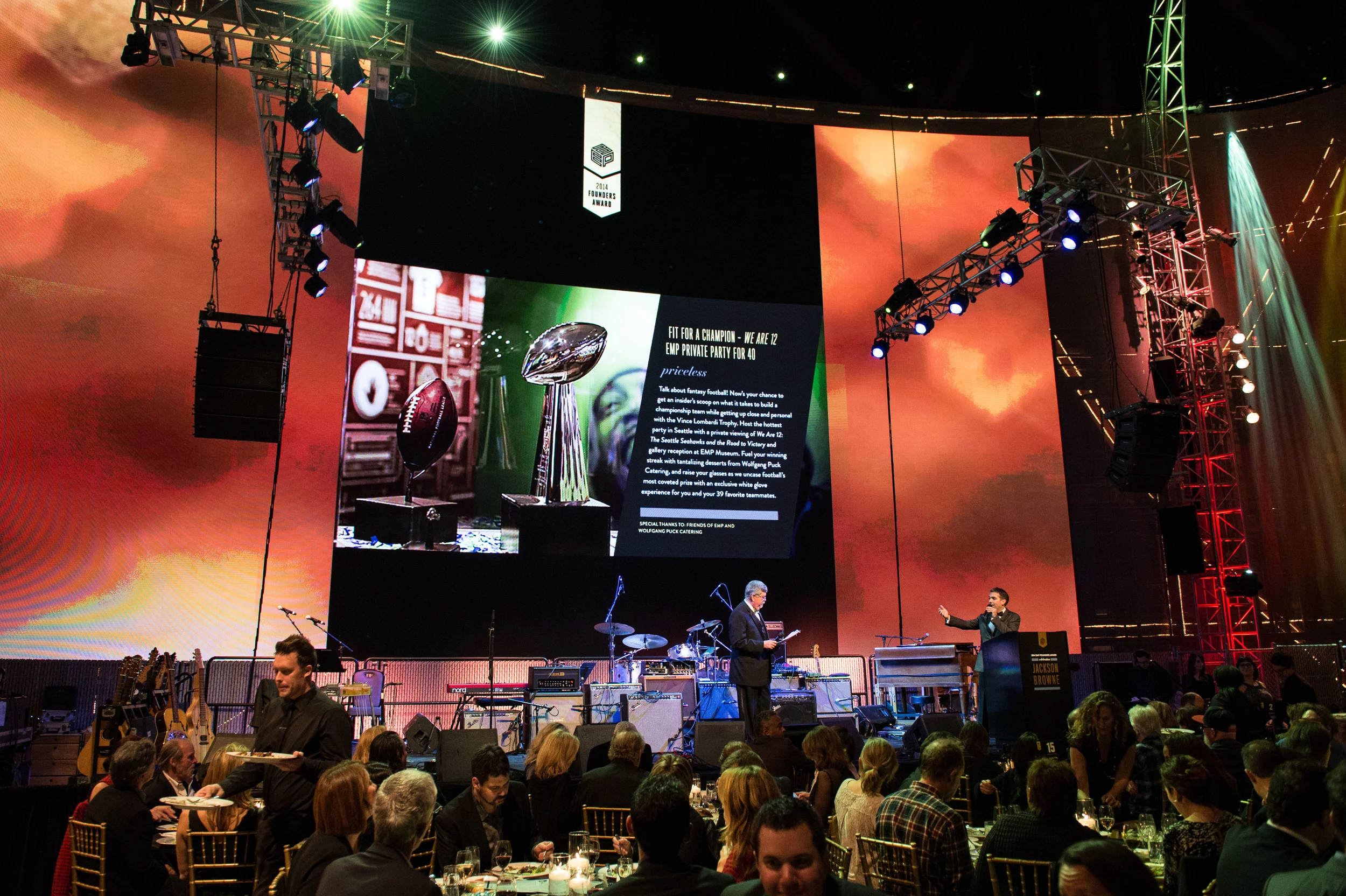 Founders Award is an annual fundraiser to benefit EMP's youth programs. The fundraiser features legendary performers who have made substantial contributions to the field of music such as Billy Cox, Crosby, Stills & Nash, Buddy Guy, and Carlos Santana to name a few. Since its inception in 2007, the gala has raised more than $2.6 million in support of vital youth development programming. In 2014, EMP honored American singer-songwriter and musician Jackson Browne. Project Goals: The Founders Award is an elegant gala that calls for a sophisticated, sleek, and bold design. Founders Award has an extensive amount of collateral needs from invitations to the evening program and dinner menus, to auction paddles and digital auction screens. I wanted each piece to feel unique and special, yet still part of a cohesive gala identity. These choices in print affect the look and feel of the event with regards to linens, table decor, etc. Execution: I chose a dramatic, high-contrast color palette of black, white, gray, and metallic gold for a classy, timeless look. I kept the fonts and the overall design aesthetic fairly tradition and subdued, instead letting the paper choices and various printing techniques (foils, etc.) carry the weight of — and elevate — the overall design.